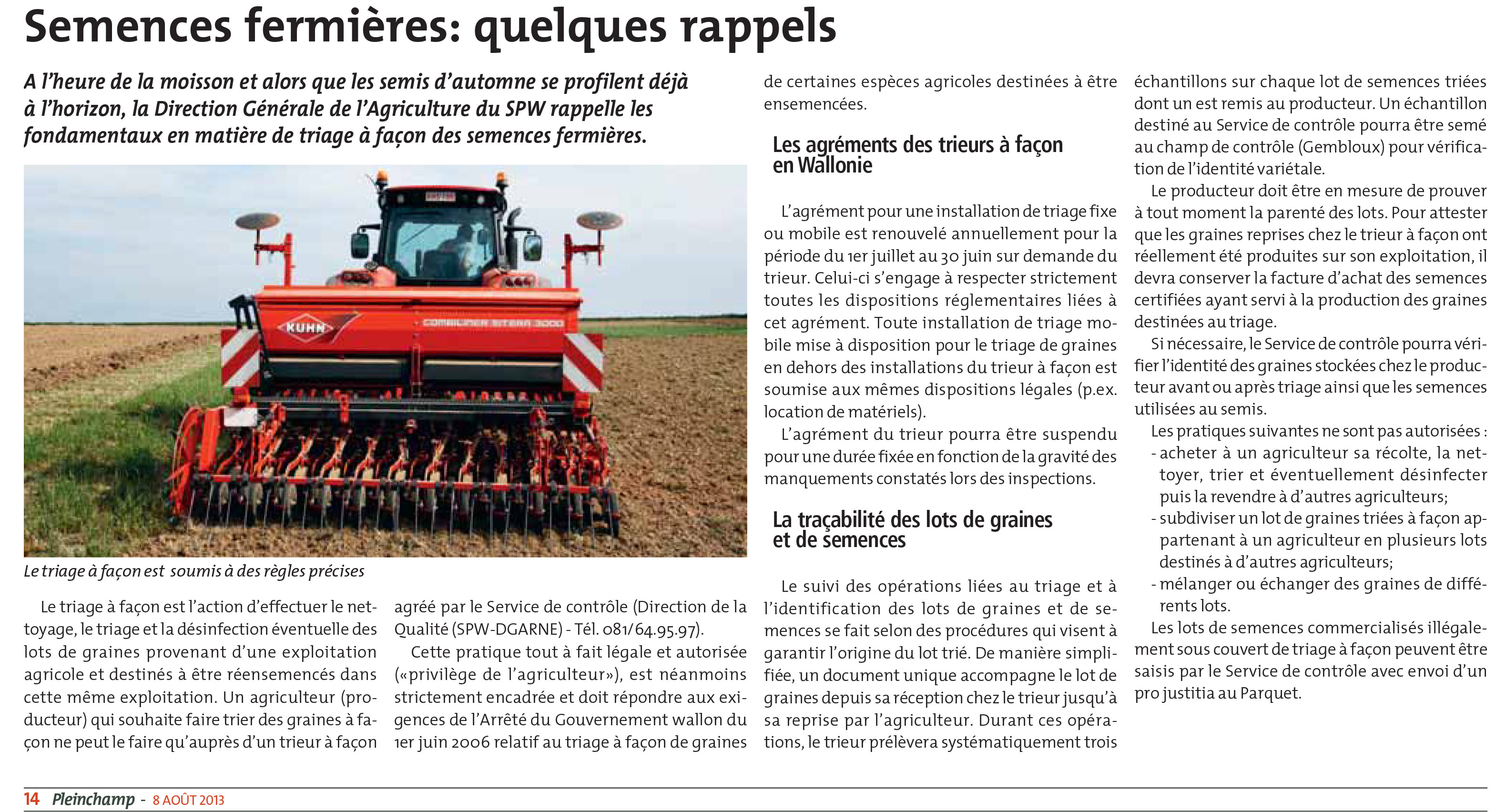 Cette pratique autorisée ("privilège de l'agriculteur") est néanmoins strictement encadrée et doit répondre aux exigences de l'Arrêté du Gouvernement wallon du 1er juin 2006 relatif au triage à façon de graines de certaines espèces agricoles destinées à être ensemencées et de l'Arrêté du Gouvernement wallon du 9 février 2006 relatif à la production et à la commercialisation des semences de céréales.